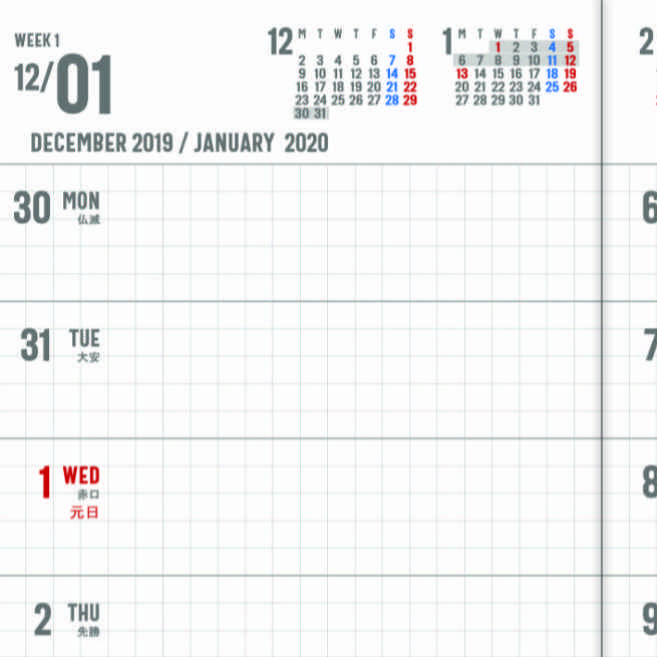 期間は2019年12月30日から2021年1月10日までのほぼ1年間で前後に余分な日にちはほとんど入っていません。一般的な見開き2週間のカレンダーがどれくらい余裕を入れているのかは分かりませんが、ページ数を節約するためギリギリにしています。